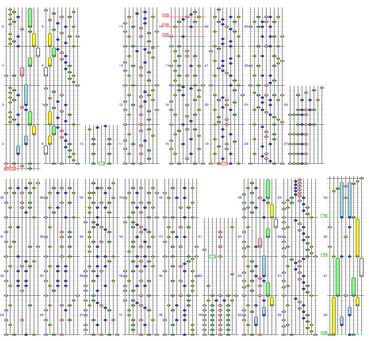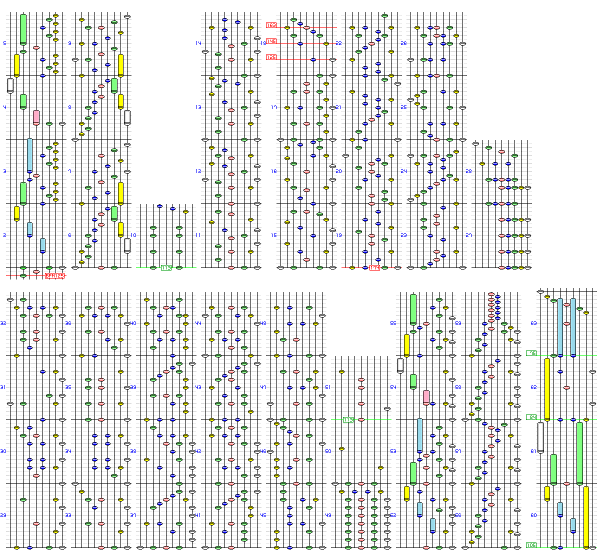 - メインBPMは174。113から174に徐々に加速し、113から75に徐々に減速する。