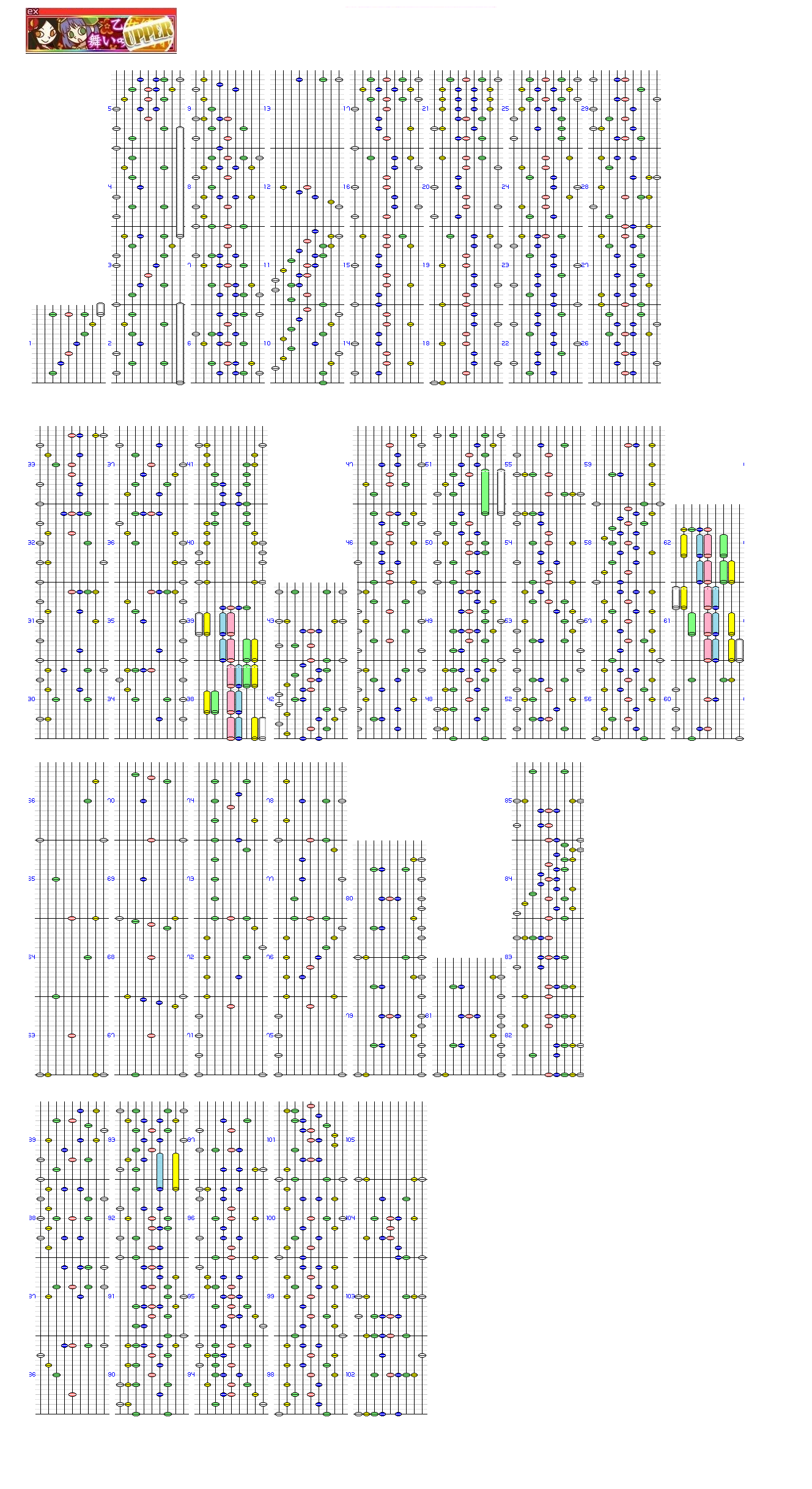 - しかも途中から緑が混じり、もはや左右振りというより脳トレ譜面と化してしまう。癖のつきかたが尋常ではないと予想されるため、プレイしていて「この配置はどういう動きを要求されているのか」が理解できないようなら早めに撤退しておかないと傷が深くなる恐れがある。