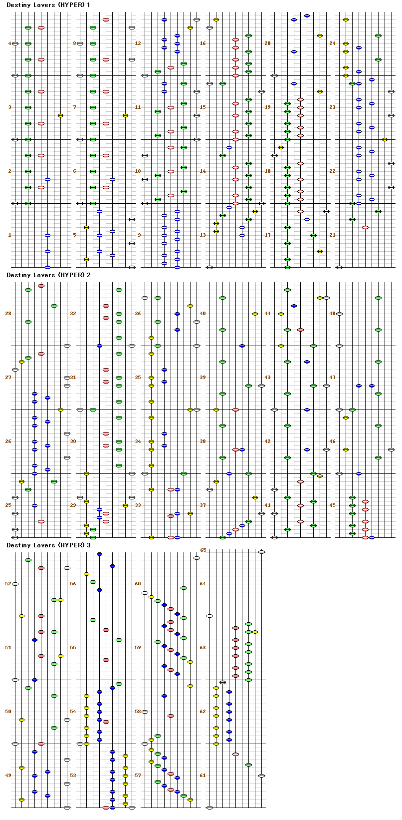 - ラストに結構きつい階段そして交互押しが来る。階段のほうは中階段や折り返し階段が何度か降ってくるので結構きつい。階段が苦手な人はランダム推奨。交互押しの方は落ち着いて譜面を見て押せば落ちることは無い。