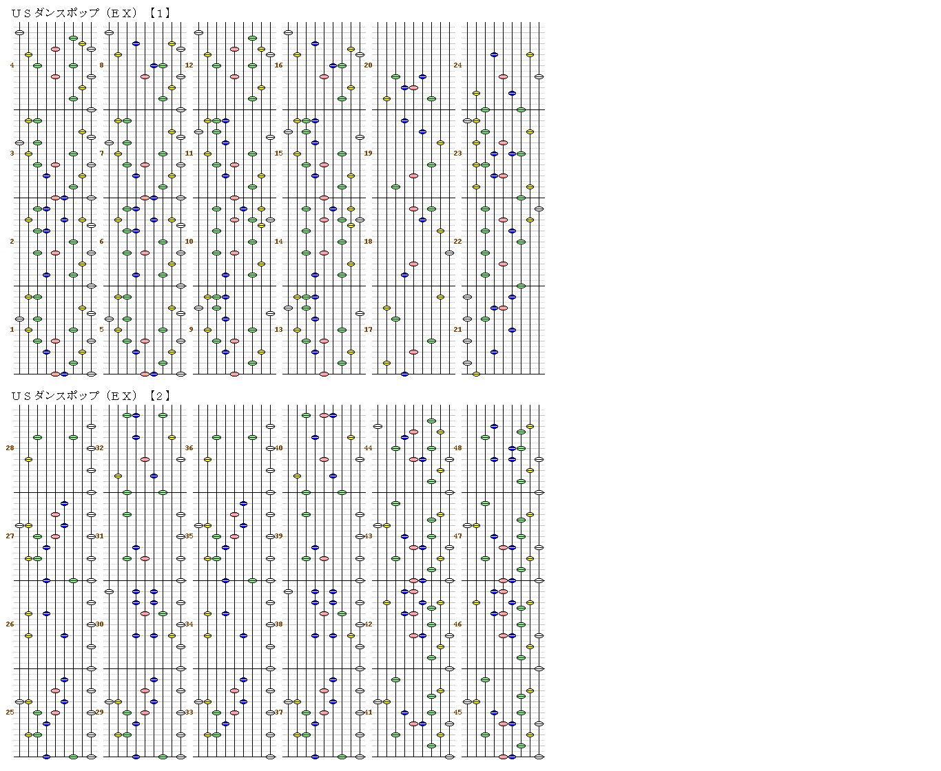 - H譜面にそのままオブジェを付け足した配置となっているのが特徴で、ハイパーよりも隣接(縦)押し又は三角押しの連続でリズムが少々複雑。とにかく回数が多く様々なパターンで出てくるので、苦手ならこれを機に練習してみよう。